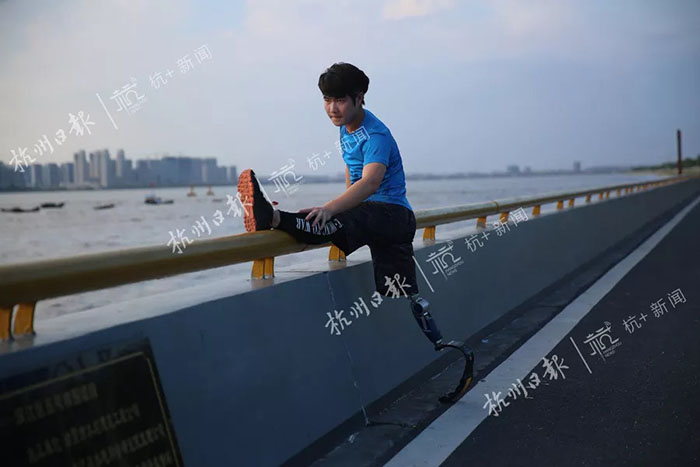 運動給黃榮杰帶去了更多自信,使他能將自己身體的殘缺暴露于人前。他穿著短褲,也沒有套假肢外的殼子,而是完整的假肢露在短褲外,迎著各種目光,走