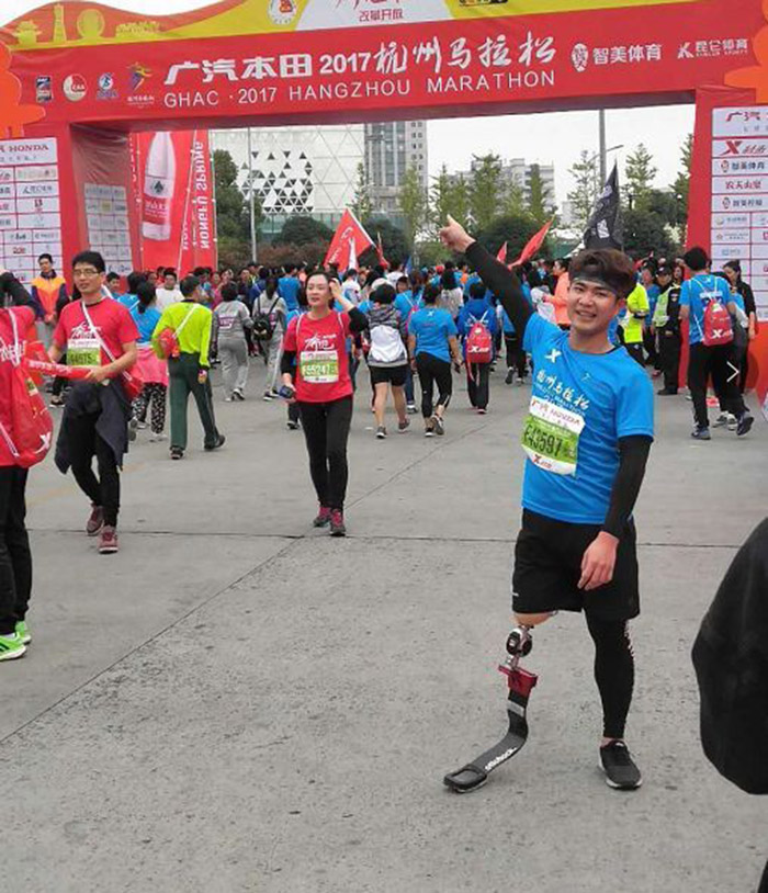 2017年杭馬,黃榮杰站在了起跑線上:“我不知道自己能不能堅持到終點,7公里對正常人來說可能并不長,但對我們來說要跑下來真的是非常難。因為我是一個右大腿截肢的人,只能依靠殘肢的力量帶動假肢去跑。”